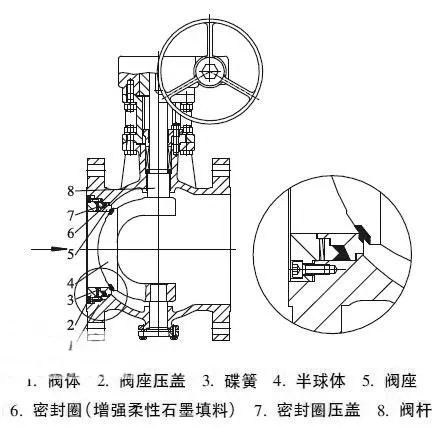 進口偏心半球閥密封副的特點是閥門關閉時,閥座壓蓋壓緊碟簧,由碟簧推動密封壓蓋和閥座向半球體壓緊,并使碟簧在設計變形范圍內(nèi),使密封副之間的作用力達到密封必須比壓,真空技術網(wǎng)認為這樣可以保證閥門在低壓時不發(fā)生內(nèi)漏現(xiàn)象。在閥門啟閉過程中,閥座、密封壓蓋和密封圈作為一個構件隨著半球體開啟角度的變化在管道軸線方向適量懸浮移動,在介質(zhì)壓力作用下向半球體壓緊,其向閥瓣壓緊的作用力隨著介質(zhì)壓力的升高而增大,從而達到自密封效果。