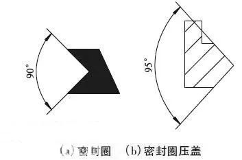 為了在升壓初期密封圈處不發(fā)生內(nèi)漏,將密封圈做成90°的V 形口,密封圈壓蓋做成95°的V 形面(圖2) 。在碟簧預緊力作用下,利用密封圈壓蓋和密封圈之間的角度差,密封圈受到壓緊力后,開口適度增大,在徑向方向貼緊閥體和閥座,如果在有介質(zhì)作用力下,V 形開口也會增大,這樣會貼合更緊,密封效果更好。密封圈與閥座接觸的面做成斜面,便于增大接觸面的密封長度。為了使閥門滿足425°C 高溫狀態(tài)的工作要求,密封圈材料選擇編織或增強柔性石墨,碟簧材料選擇60Si2MnA 或Inconel。