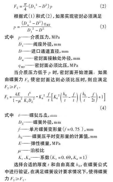 (1) 密封預緊力。通過螺栓產(chǎn)生一定的預緊力,再由閥座壓蓋傳遞給碟簧,使得碟簧產(chǎn)生變形。為了延長碟簧使用壽命,碟簧的變形量不能超過自由高度的75%,通過系列力的傳遞使密封副達到設計的密封比壓。