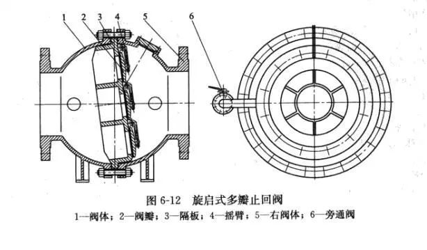 03多瓣式對于大口徑止回閥,如果采用單瓣式結構,當介質反向流動時,必然會產生相當大的水力沖擊,甚至造成閥瓣和閥座密封面的損壞,因而采用多瓣式(圖6-12)結構。它的啟閉件是由許多個小直徑的閥瓣組成的,當介質停止流動或倒流時,這些小閥瓣不會同時關閉,大大減弱了水力沖擊。由于小直徑的閥瓣本身重量輕,關閉動作也比較平穩(wěn),閥瓣對閥座的撞擊力較小,不會造成密封面的損壞。多瓣式適用于公稱尺寸DN600以上的止回閥。較大口徑的旋啟式止回閥可帶有旁通閥。