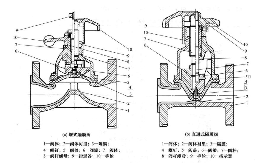 隔膜閥的關(guān)閉件-軟質(zhì)隔膜,由閥桿控制并做上、下運動以切斷介質(zhì)。具體隔膜閥內(nèi)部構(gòu)造圖如上圖所示。操縱機構(gòu)和介質(zhì)由隔膜隔開。隔膜閥只有閥體和隔膜會與介質(zhì)相接觸,其他的閥桿等并不會接觸,因此常常用于衛(wèi)生級管道環(huán)境和有著特殊介質(zhì)接觸規(guī)定的環(huán)境。堰式隔膜閥和直通式隔膜閥的結(jié)構(gòu)如圖所示